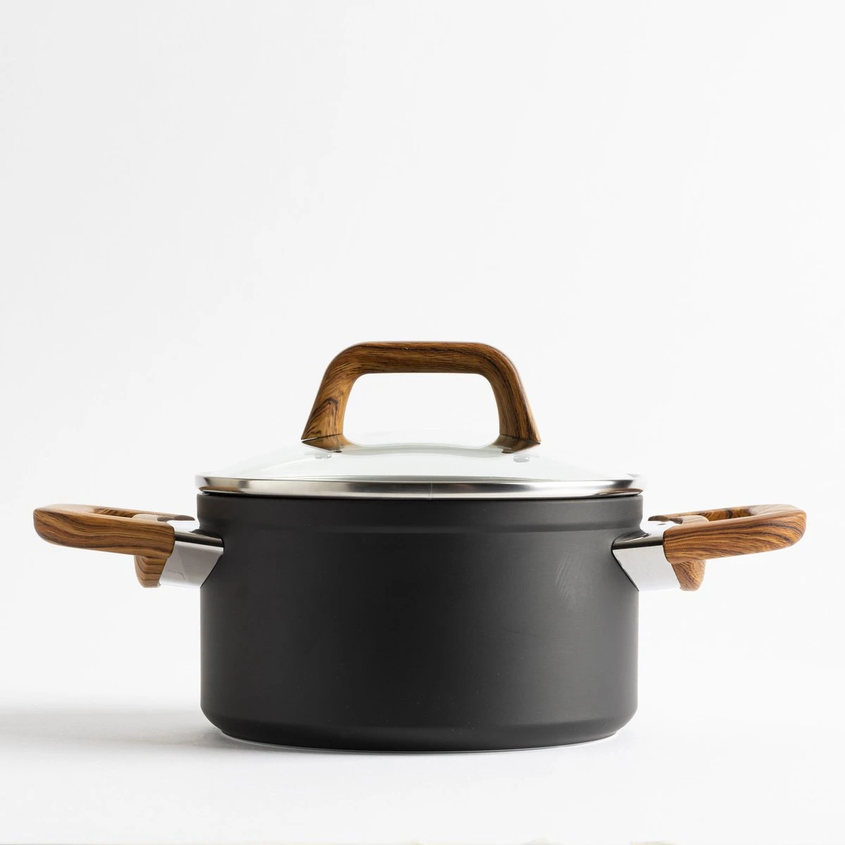 Deze PFAS-vrije Gero Mark Aluminium Kookpannenset – 4 delig staat stoer op het fornuis en op tafel. De zwarte kleur van de pan en de hout-look grepen geven de pannen een strak design. Black is beautiful, maar ook functioneel! Door de zwarte coating maak je de pannen gemakkelijk schoon.