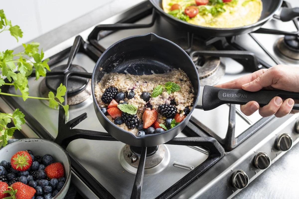 GreenPan is het merk voor iedereen die écht gezond wil koken! Alle potten en pannen hebben een gezonde keramische Thermolon™ antikleeflaag. Die is gemaakt met natuurlijke grondstoffen, zoals zand en bevat géén PFAS. Iets wat de meeste merken van antikleefpannen wél nog steeds doen. Met de keramische antikleeflaag van GreenPan ben je dus zeker dat er geen toxische stoffen kunnen vrijkomen, zelfs als je graag kookt op hoge temperaturen.
