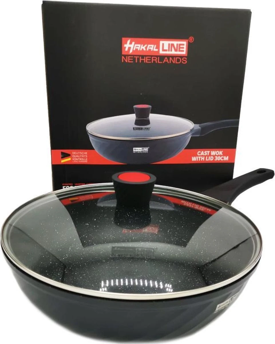 De wokpan heeft een anti-aanbaklaag met zwartmarmeren afwerking die ervoor zorgt dat het eten niet blijft kleven aan de pan en minder olie of boter nodig is.