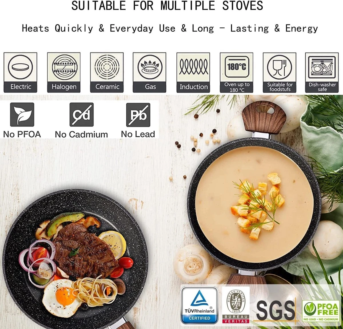 De duurzame pannen zijn met Zwitserse precisie vervaardigd en hebben een hoogwaardige antiaanbaklaag met een marmeren coating en een duurzame aluminium behuizing. Door de zeer harde marmeren coating hoef jij tijdens het koken geen boter of olie te gebruiken, omdat het voedsel niet aan de pan blijft plakken. Bovendien is deze coating vrij van de giftige stof PFOA. Dit maakt het heel gemakkelijk om gezonde, smaakvolle en magere maaltijden te bereiden.