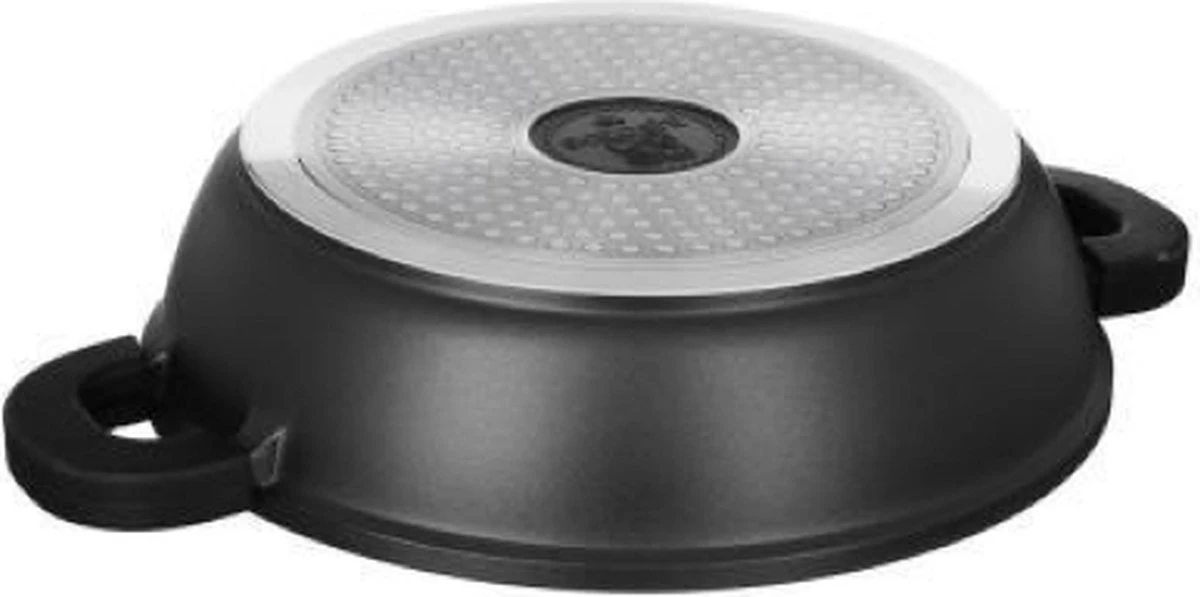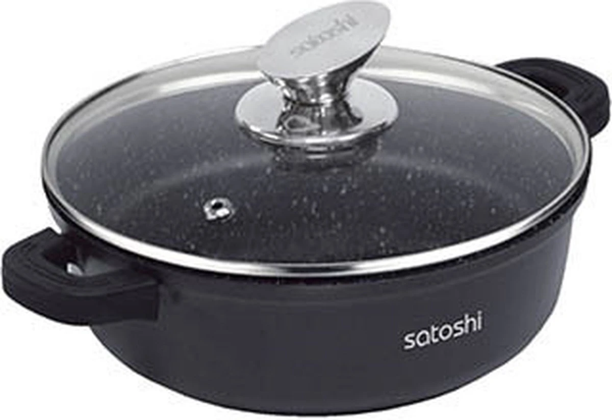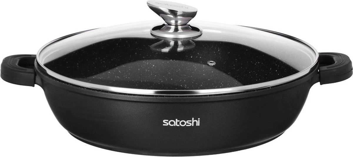De Satoshi hapjes pan gemaakt van giet aluminium heeft een diameter van 40 cm. De pan is voorzien van een anti-aanbaklaag zonder PFOA. De pan wordt geleverd met silicone handvatten die warmte vast zijn tot 220 graden. Geschikt voor alle warmtebronnen en gebruik in de oven.
