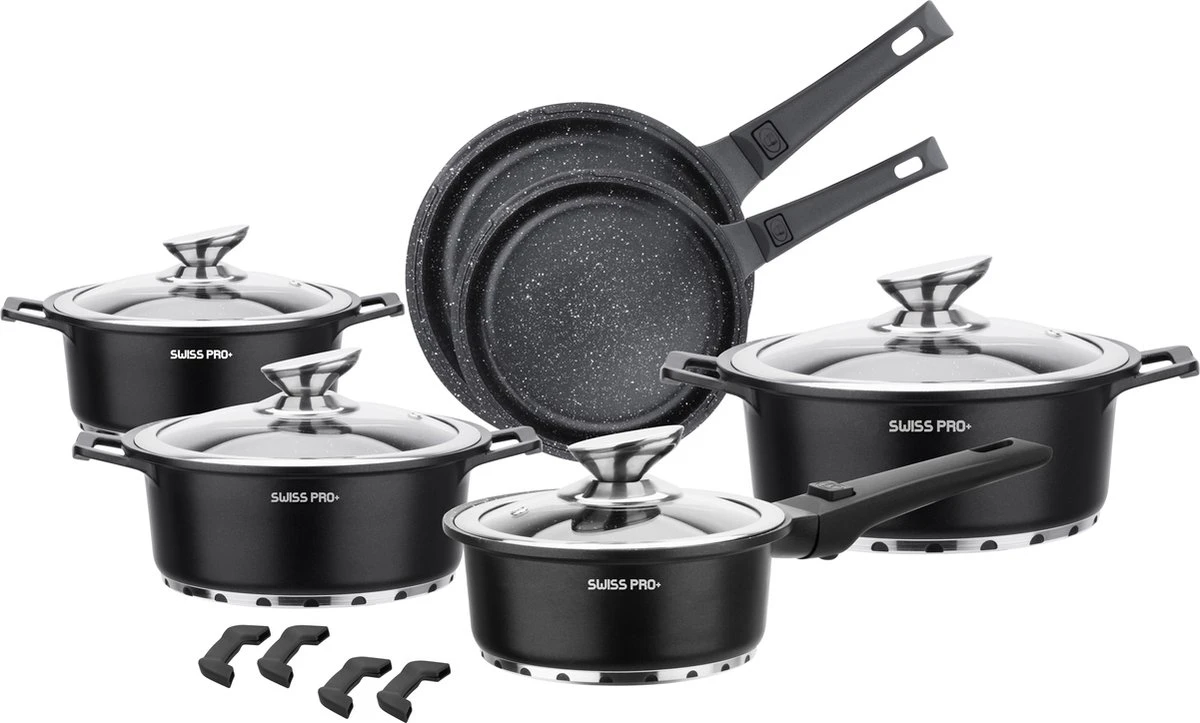 Swiss Pro+ | Set 14 Delige Pannenset | Inductie – Pannensets – Glazen deksel – Met afneembare handgreep – Marmeren interieur -PFAS-vrij | Black (Zwart)
