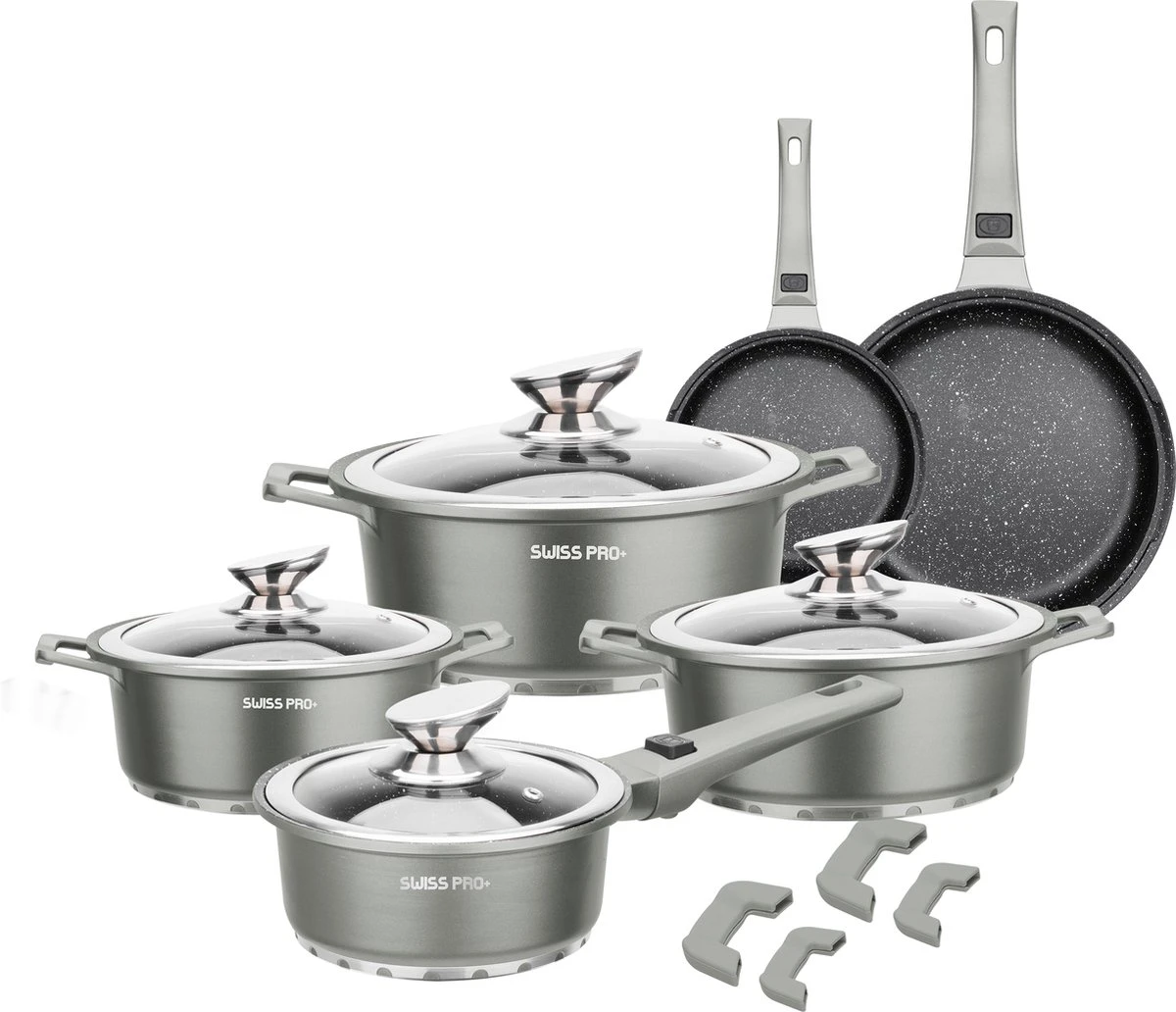 Swiss Pro+ | Set 14 Delige Pannenset | Inductie – Pannensets – Glazen deksel – Met afneembare handgreep – Marmeren interieur -PFAS-vrij | Grey / Silver